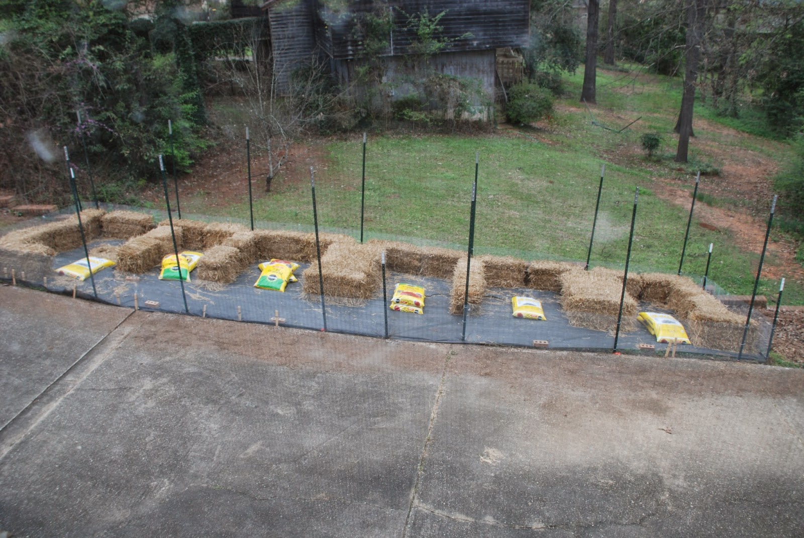 My garden lay-out: I mapped out my straw bale garden on graph paper, right down to what I would plant in each bale. Did you know that you can plant 48-60 carrot plants in 1 bale??!!! That is just amazing! I worked out my shopping list based on the size garden I would have and how I would have to manage (and defend) it. Defend from what? I’m right in the middle of town, but still have regular nightly visits from at least one raccoon family, a mess o’ possums, foxes – both silver and red, an armadillo, and more rabbits than I can shake a stick at – every time I shake a stick there’s more rabbits. By day, the trees bustle with flights and leaps of crows and squirrels, just waiting for me to turn my back, so they can launch their daily raids, not just on tender shoots, but the straw itself.